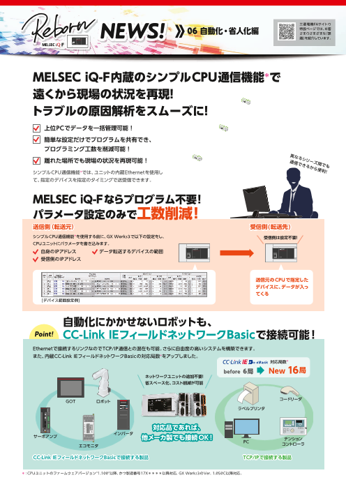 MELSEC iQ-F内蔵のシンプルCPU通信機能*で遠くから現場の状況を再現! トラブルの原因解析をスムーズに!◆上位 PC でデータを一括管理可能!◆簡単な設定だけて...