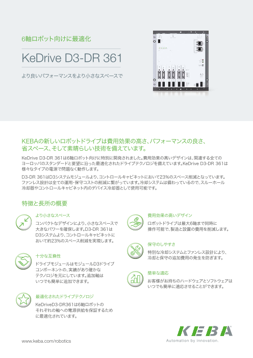 KEBAの新しいロボットドライブは費用効果の高さ、パフォーマンスの良さ、省スペース、そして素晴らしい技術を備えています。KeDrive D3-DR 361は6軸ロボット向けに特別に開...