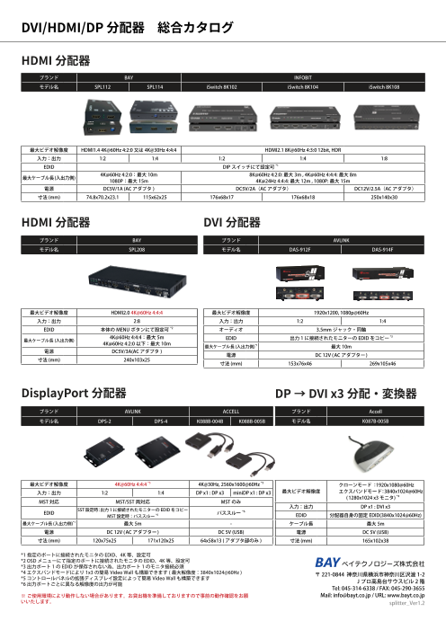 AVLINKからは、HDMIスイッチャー、HDMI/DVIスプリッター等を取扱い中。OPHIT製品も各種コンバーター、HDMI/DVIスプリッター等がございます。DisplayPort/MiniDisplayPortの...
