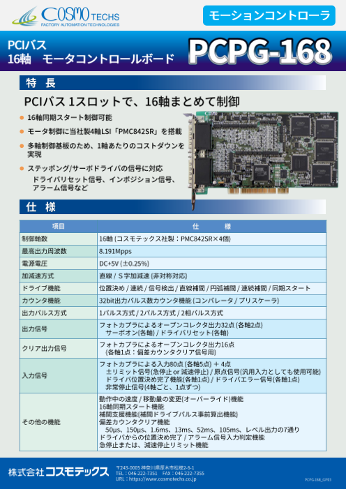 PCPG-168は、高機能LSI「PMC842SR」を搭載した16軸モータコントロールボードです。補間機能や同期制御などの機能をPCIバスから直接制御する事で様々な装置へ応用可能です。 ...