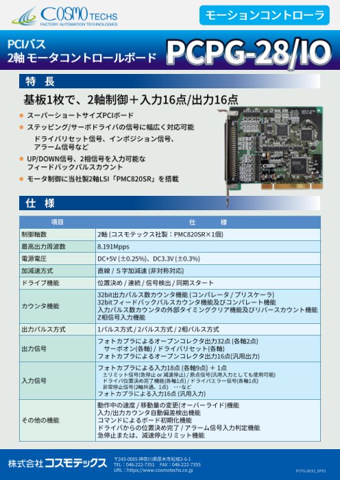 PCPG-28/IOは、モータ2軸と入出力16点/16点の制御が可能なモータ・I/Oコントローラボードです。 動作確認用ソフトウェアを用意しておりますので、製品セットアップ後すぐに...