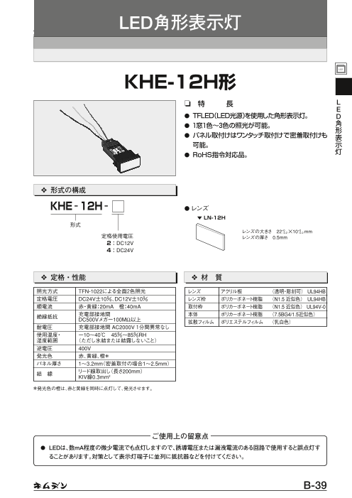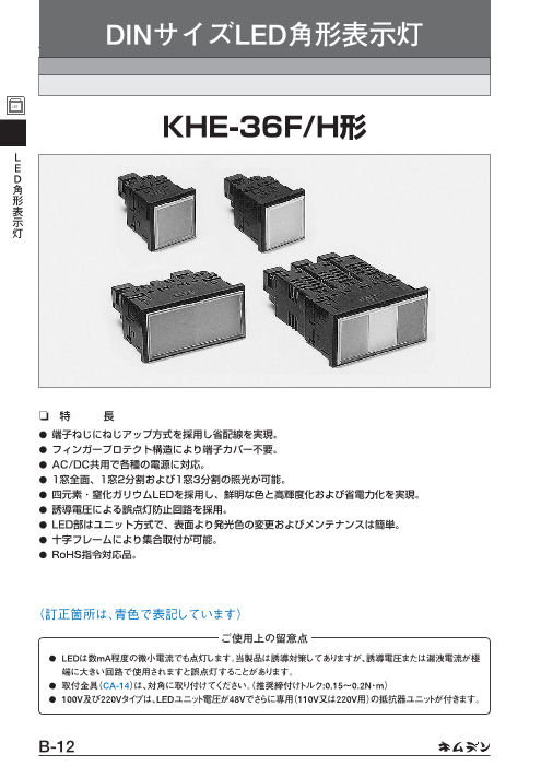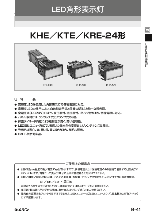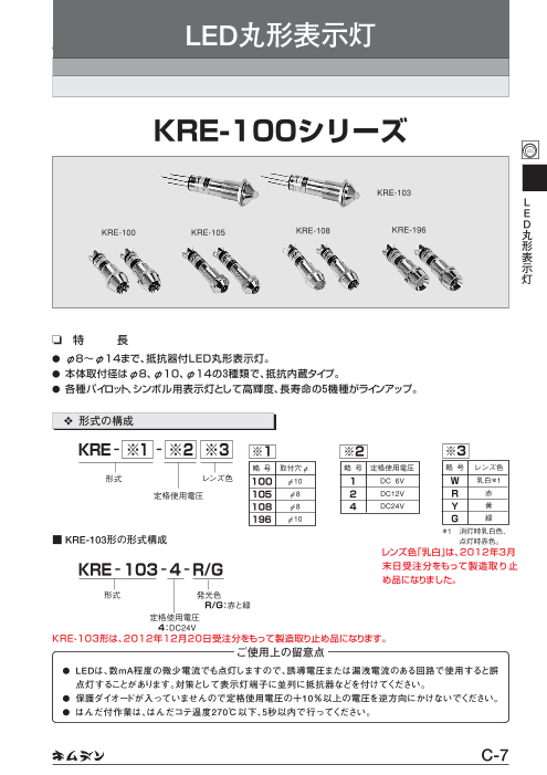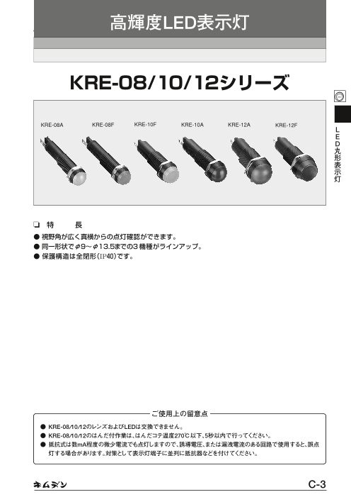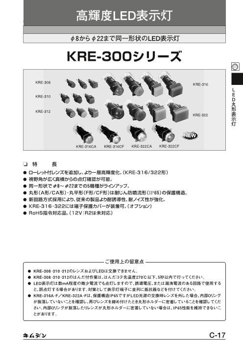 ❏ 特 長● ローレット付レンズを追加し、より一層高輝度化。(KRE-316/322形)● 視野角が広く真横からの点灯確認が可能。● 同一形状でφ8~φ22までの5機種がライ...