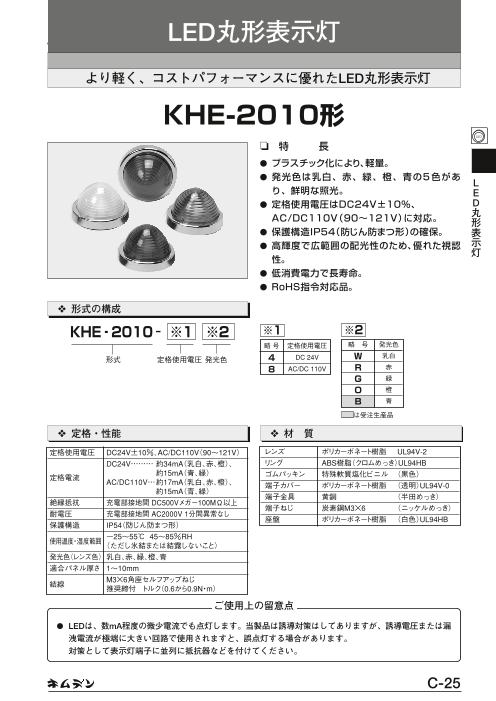◆プラスチック化により、軽量。◆発光色は乳白、赤、緑、橙、青の5色があり、鮮明な照光。◆定格使用電圧はDC24V±10%、AC/DC110V(90~121V)に対応。◆保護構造IP54(防じん...
