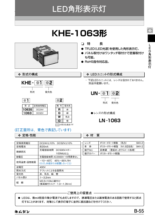 ◆LEDユニットは、AC・DC共用で、24Vのほかに48Vも標準化。◆発光色は、乳白、赤、緑、橙、黄の5色があり、鮮明な照光。◆LED部は、ユニット方式で、表面より発光色の変更およ...