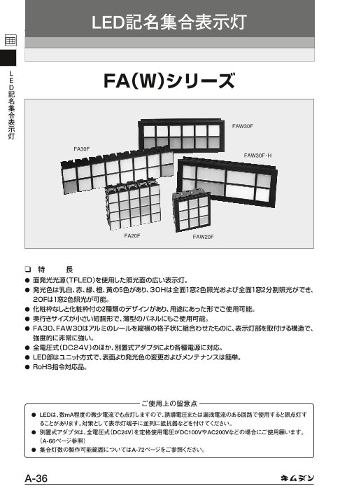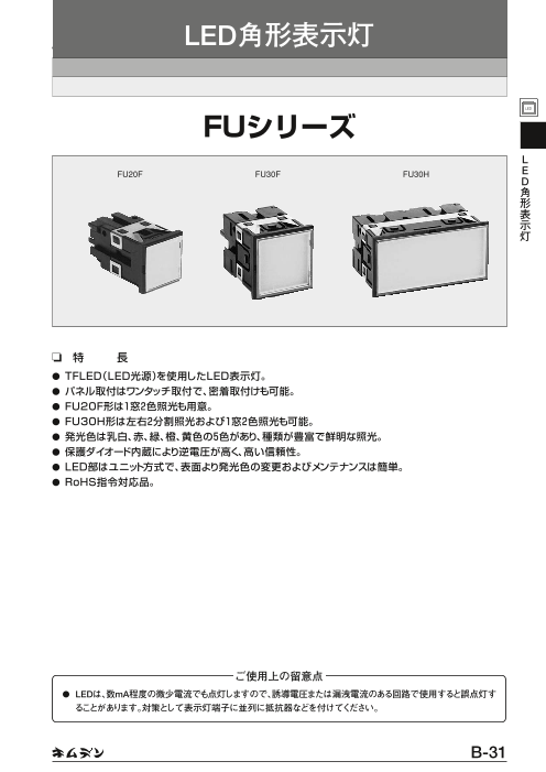 ◆パネル取付はワンタッチ取付で、密着取付けも可能。◆FU20F形は1窓2色照光も用意。◆FU30H形は左右2分割照光および1窓2色照光も可能。◆発光色は乳白、赤、緑、橙、黄...