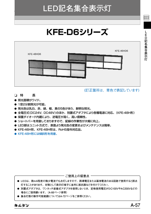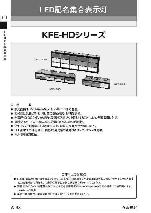 ◆1窓2分割照光が可能。◆発光色は乳白、赤、緑、橙、黄の5色があり、鮮明な照光。◆全電圧式(DC24V,DC48V)のほか、別置式アダプタにより各種電源に対応。(KFE-48H形)◆...