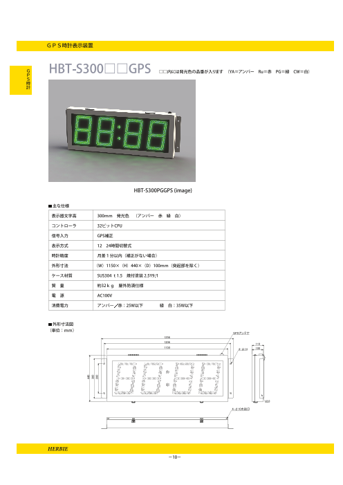 表示器文字高:300mm 発光色(アンバー/赤/緑/白)コントローラ:32ビットCPU信号入力:GPS補正表示方式:12/24時間切替式時計制度:月差1分以内(補正がない場合)...