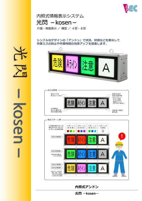 シンプルデザインのLED内照式アンドン。各窓の発光色が3色に変化し、状況を色で表現します。発光色は入力信号に合わせて変化させることが可能です。標準品は4窓タイプとな...
