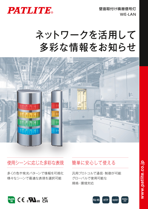 LAN(RJ-45端子)ケーブルで簡単接続で制御ができる9色表示で多彩な発光パターンで様々なシーンで報知できる壁面取付け積層信号灯です。