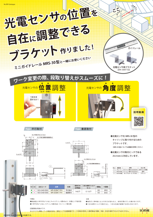 ●光電センサをMRS-30型のキャリッジに取り付けるためのブラケットです。●光電センサの取付ピッチである25.4 mmに対応しています。●このブラケットを使うことで、光電セ...