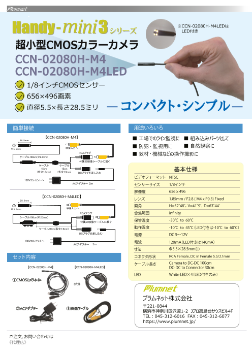 φ5.5x28.5、解像度32万画素、超小型CMOSカラーカメラ
