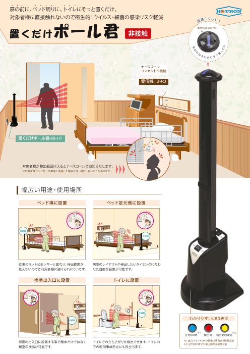 『置くだけポール君』は、自動ドアセンサーの技術を活用した高精度な赤外反射式方式の離床センサーです。対象者様に直接触れないのでウイルス・細菌の感染リスクを軽減!...