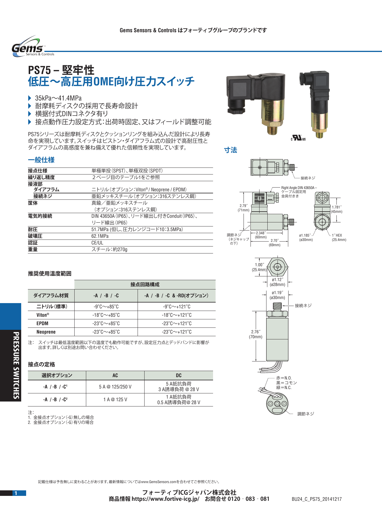 • 35kPa~41.4MPa• 耐摩耗ディスクの採用で長寿命設計• 横据付式DINコネクタ有り• 接点動作圧力設定方式:出荷時固定、又はフィールド調整可能