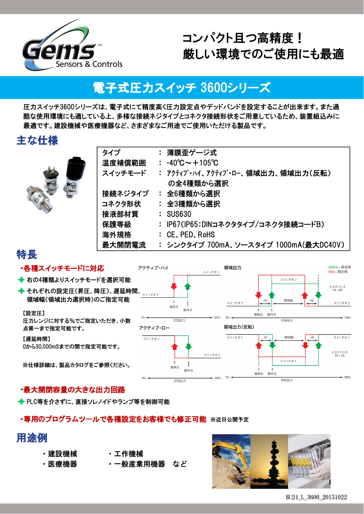【圧力スイッチの特長】・コンパクト・広範な温度補償範囲(-40℃~+105℃)・スイッチモード:アクティブ・ハイ、アクティブ・ロー、ウインドウ出力、ウインドウ反転出力の...