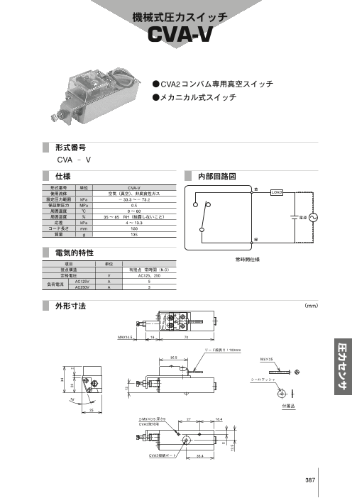 ・メカニカル式スイッチ・使用流体 空気(真空)、非腐食性ガス・設定圧力範囲 -33.3~-73.2kPa・保証耐圧力 0.5MPa・周囲温度 0~60℃・周囲湿度 35~85% RH...