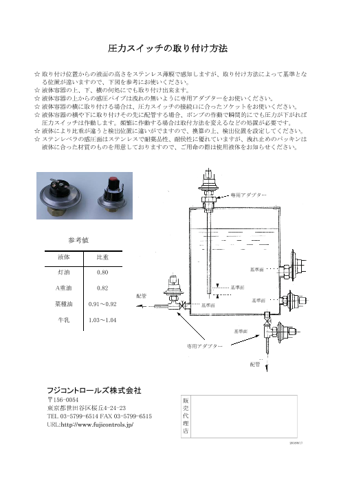◆液体容器の上、下、横の何処にでも取り付け出来ます。◆液体容器の上からの感圧パイプは洩れの無いように専用アダプターをお使いください。 ◆液体容器の横に取り付ける場合...