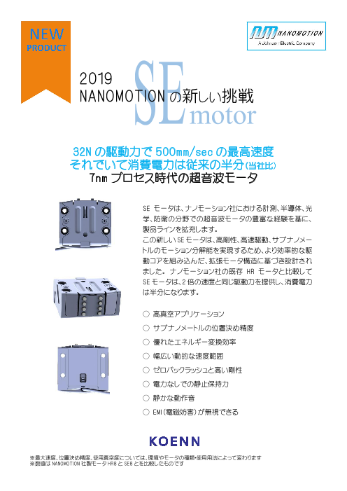 SEモータは、ナノモーション社における計測、半導体、光学、防衛の分野での超音波モータの豊富な経験を基に、製品ラインを拡充します。この新しいSE モータは、高剛性、高速駆...