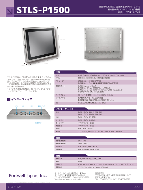 STLS-P1500は、完全防水仕様の産業用タッチパネルPCです。全面ステンレス製でIP66/67/69Kに対応しております。Intel CPU搭載でOSはWindows10/11に対応。高い堅牢性を求められ...