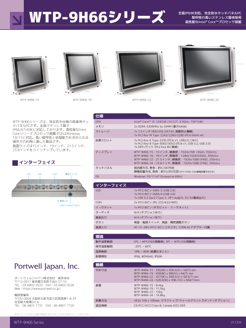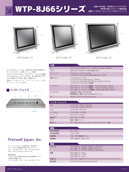 WTP-8J66シリーズは、完全防水・防塵仕様の産業用タッチパネルPCです。全面ステンレス製でIP66/67/69Kに対応しております。Intel CPU搭載でOSはWindows10/11に対応。高い堅牢性を求められる場所での利用に適した製品です。画面サイズは15インチ、19インチ、21.5イ...