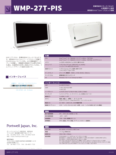 WMP-27T-PISは、医療用途向けタッチパネルPCです。高性能なIntel Coreシリーズプロセッサ搭載でOSはWindows 10/11に対応。4Kの高解像度ディスプレイを搭載し、高精細な映像表...