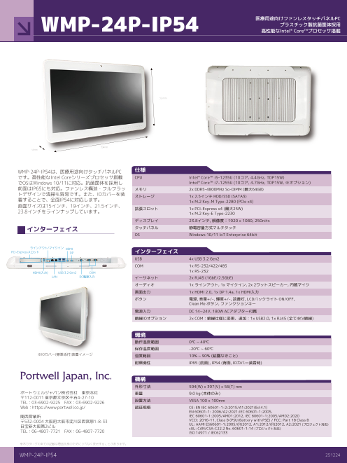 WMP-24P-IP54は、医療用途向けタッチパネルPCです。高性能なIntel Coreシリーズプロセッサ搭載でOSはWindows 10/11に対応。抗菌筐体を採用し前面はIP65にも対応。ファンレス構...