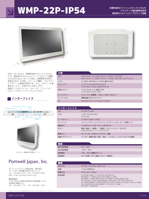 WMP-22P-IP54は、医療用途向けタッチパネルPCです。高性能なIntel Coreシリーズプロセッサ搭載でOSはWindows 10/11に対応。抗菌筐体を採用し前面はIP65にも対応。ファンレス構...