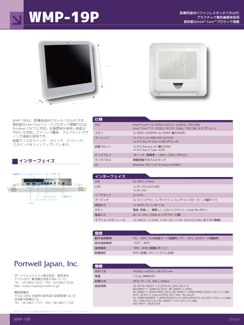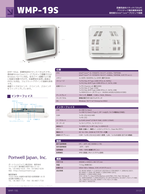 WMP-19Pは、医療用途向けタッチパネルPCです。高性能なIntel Coreシリーズプロセッサ搭載でOSはWindows 10/11に対応。抗菌筐体を採用し前面はIP65にも対応。ファンレス構造...