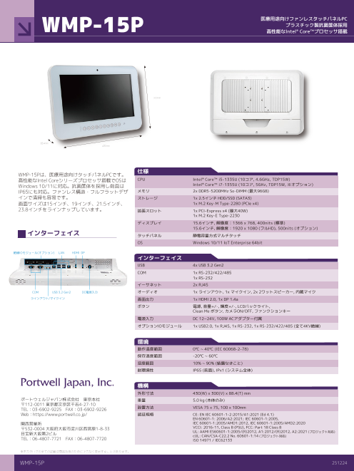 WMP-15Pは、医療用途向けタッチパネルPCです。高性能なIntel Coreシリーズプロセッサ搭載でOSはWindows 10/11に対応。抗菌筐体を採用し前面はIP65にも対応。ファンレス構造...