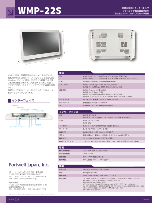 WMP-22Sは、医療用途向けタッチパネルPCです。高性能なIntel Coreシリーズプロセッサ搭載でOSはWindows 10/11に対応。空冷ファン搭載でより高い性能を発揮できます。抗菌筐...