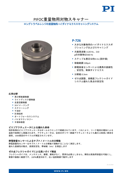 P-726 PIFOC(R)ナノフォーカスシステムは、高分解能が求められる今日の顕微鏡アプリケーションで使用されている、開口数の大きい大型対物レンズに対して、高速ステップ時間を提...