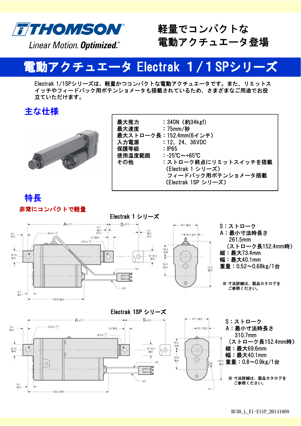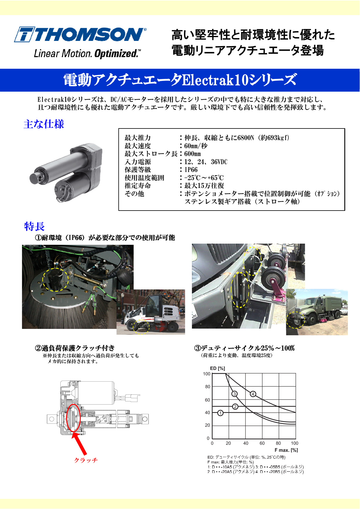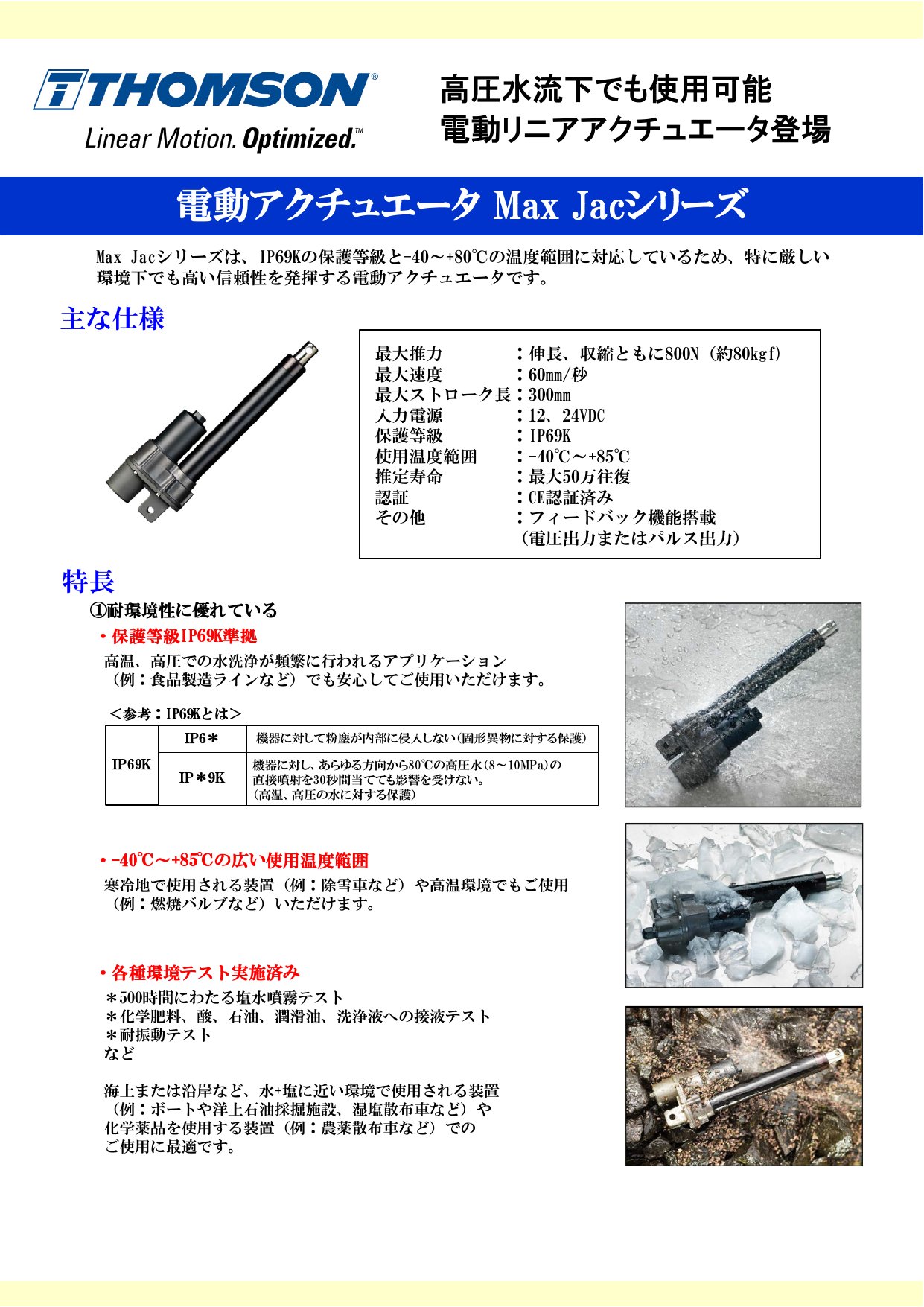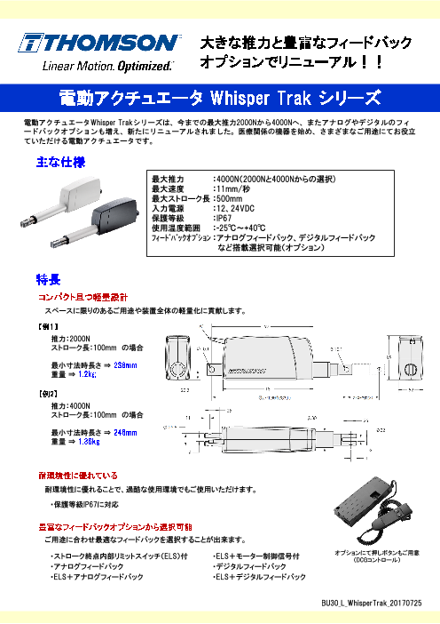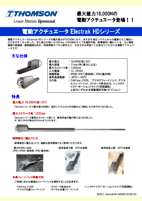 【主な特長】入力電圧:24V DC、24V DC (UL)最大負荷:10,000N (Push)、6,000N (Pull)速度(定格負荷時):16.2mm/sec(4000N仕様)ストローク:25~400mm取付寸法:≥ ...