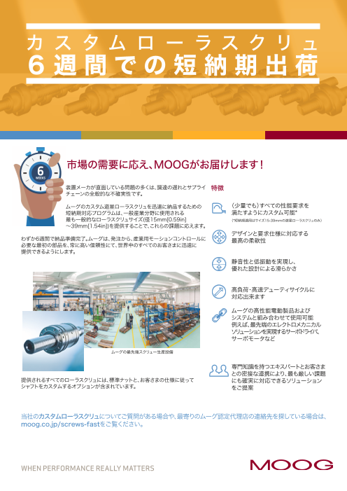 ムーグのカスタム遊星ローラスクリュを迅速に納品するための短納期対応プログラムは、一般産業分野に使用される最も一般的なローラスクリュサイズ(径15mm~39mm)を提供すること...
