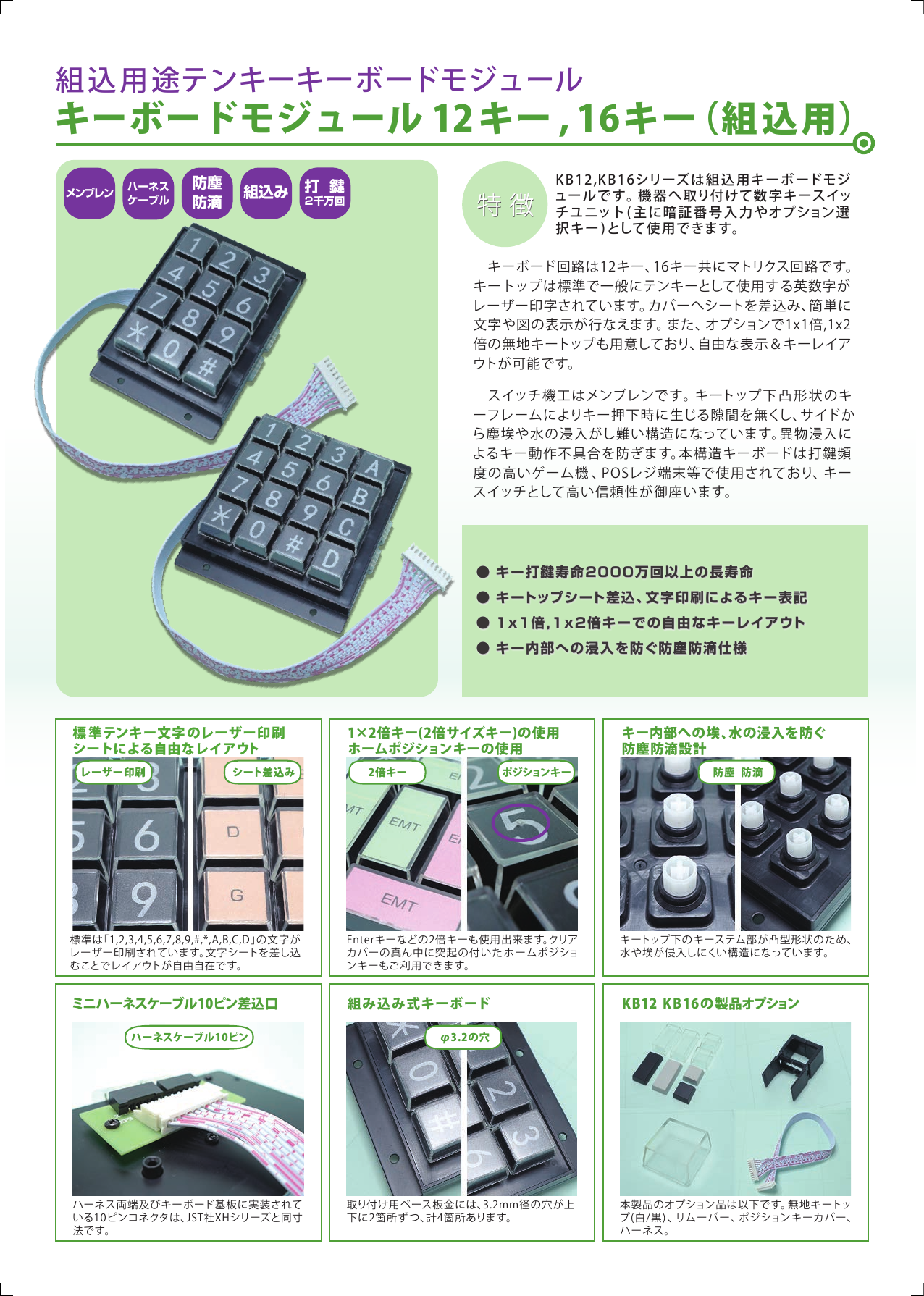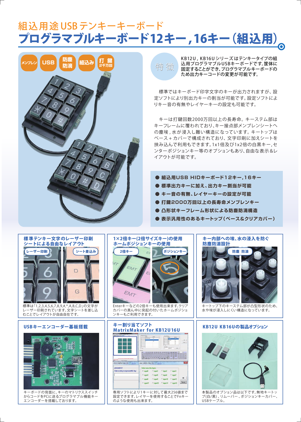 ・組込用USB HIDキーボード12キー、16キー・標準出力キーに加え、出力キー割当が可能・キー音の有無、レイヤーキーの設定が可能・打鍵2000万回以上の長寿命メンブレンキー...