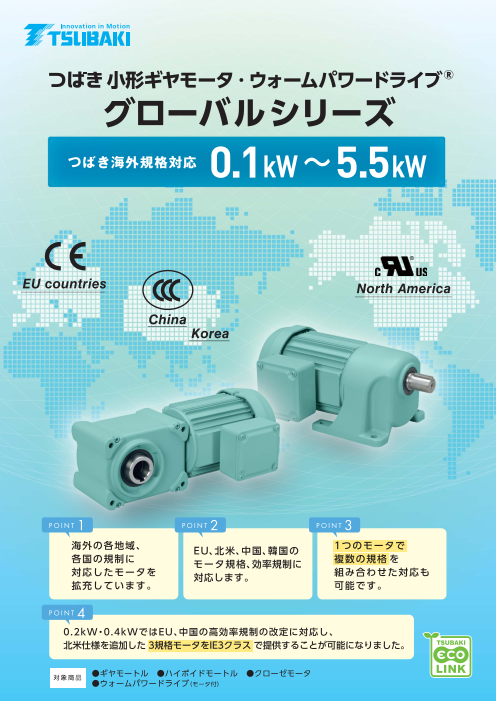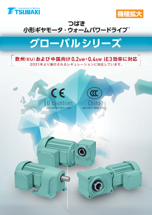 ①EU向け2021年7月より欧州委員会規制「(EU)2019/1781」では、0.2kW・0.4kWはIE2効率、0.75kW~5.5kWはIE3効率の規格を満足する必要があります。つばきでは新効率規制にさき...