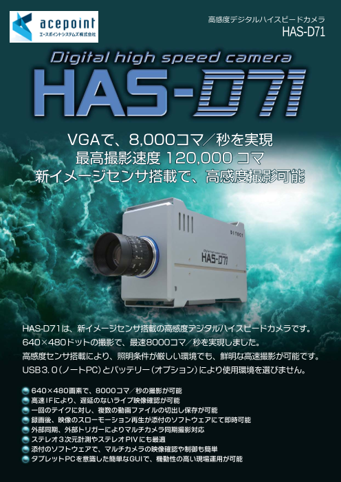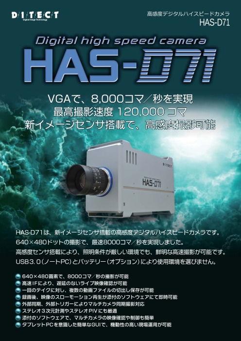 HAS-D71は、新イメージセンサ搭載の高感度デジタルハイスピードカメラです。640×480ドットの撮影で、8,000コマ/秒を実現しました。高感度センサを搭載により、照明が厳しい環境...