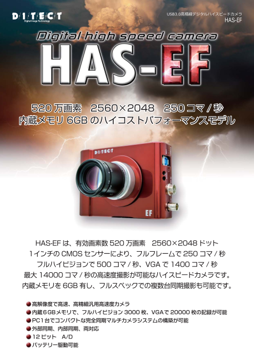 HAS-EFは、有効画素数520万画素 2560×2048ドット1インチのCMOSセンサーにより、フルフレームで250コマ/秒、フルハイビジョンで500コマ/秒、VGAで1400コマ/秒最大14000コマ/秒の...