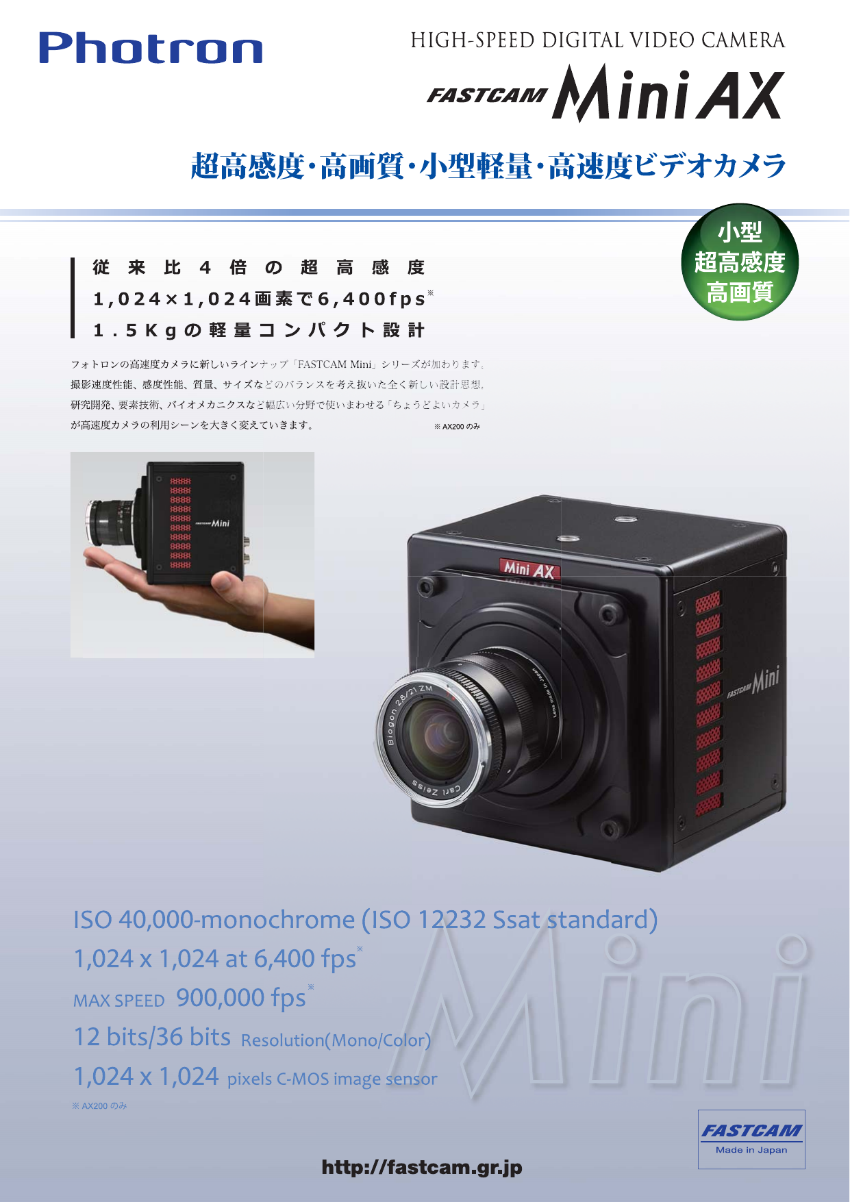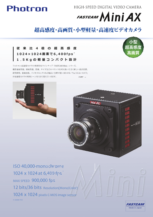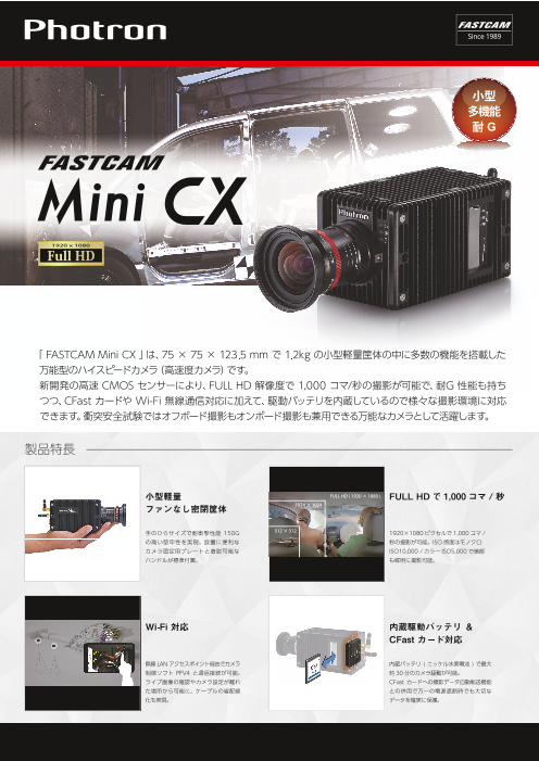 「FASTCAM Mini CX」は、75×75×123.5mmで1.2kgの小型軽量筐体の中に多数の機能を搭載した万能型のハイスピードカメラ(高速度カメラ)です。新開発の高速 CMOSセンサーにより...