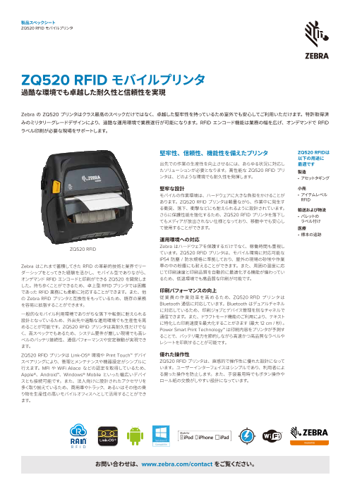 ZQ520 RFIDは、厳しい環境にも耐えられる堅牢設計で、屋外や倉庫など場所を問わずにR...