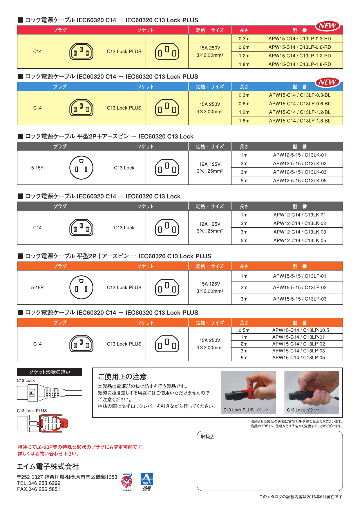【掲載製品】○ロック電源ケーブル IEC60320 C14○ロック電源ケーブル 平形2P+アースピン ◆詳細は、カタログをダウンロードしてご覧ください。
