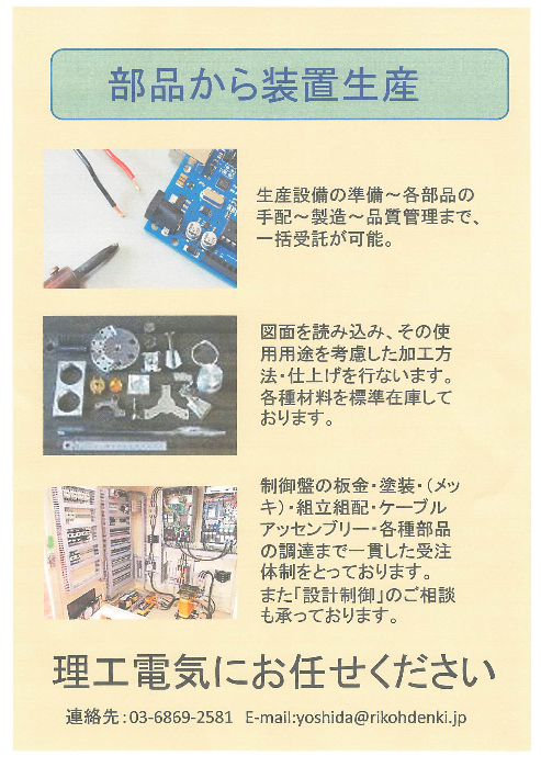 制御盤の板金・塗装・(メッキ)組立配電・ケーブルアッセンブリー・各種部品の調達まで一貫した受注体制をとっております。また「設計制御」のご相談も承っております。
