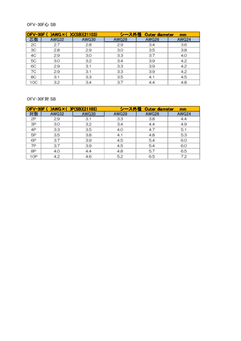 OFV-30F 固定部用途 超細径ケーブル AWG32~24までの各芯数の仕上り外径表