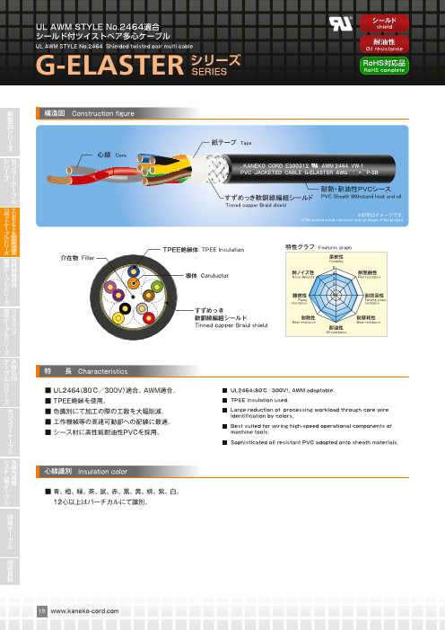 ◆UL2464(80°C/300V)適合。AWM適合。 ◆TPEE絶縁を使用。◆色識別にて加工の際の工数を大幅削減。◆工作機械等の高速可動部への配線に最適。 ◆シース材に高性能耐油性PVCを...