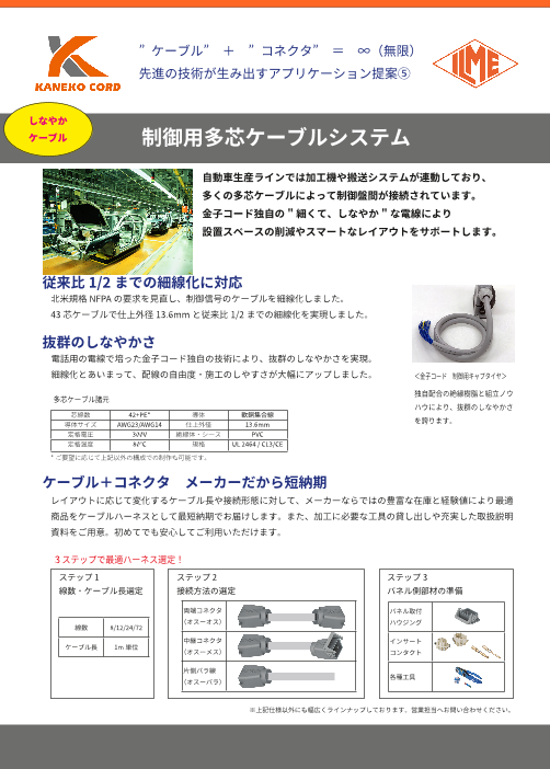 制御機器センサー用ケーブルの製品カタログです。細径導体を使用することで、高い柔軟性を実現しました。細径でありながらUL2103、UL20276に適合していますETFE樹脂...