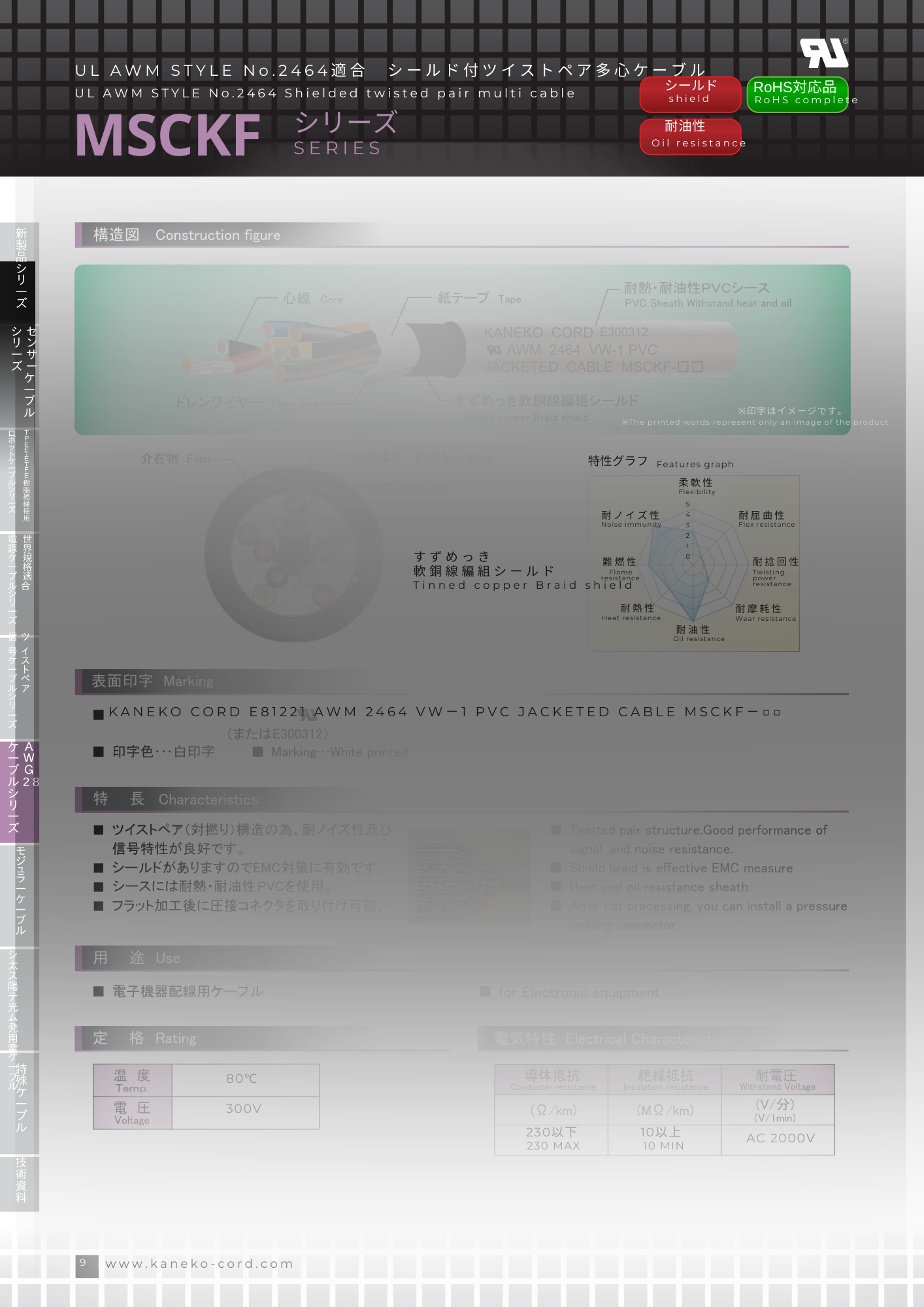 ◆ULリステッド(CL-2)・c-UL AWM、・CEマーキング対応◆導体には、30/0.079の細径軟銅線を使用。高い柔軟性を実現。◆ツイストペア(対撚り)構造の為、耐ノイズ性及び信号特...