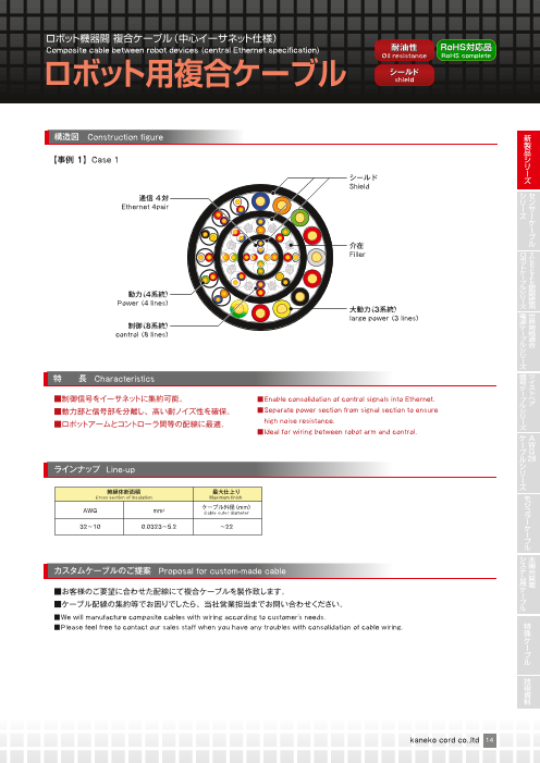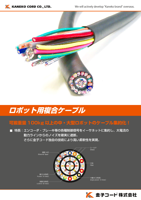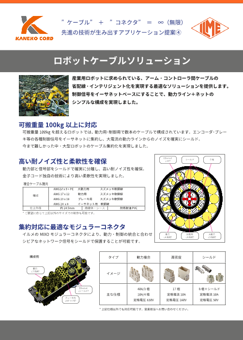 エンコーダ・ブレーキ等の各種制御信号をイーサネットに集約し、大電流の動力ラインからのノイズを確実に遮断。さらに金子コード独自の技術により高い柔軟性を実現。多軸...
