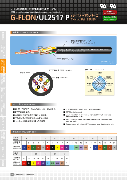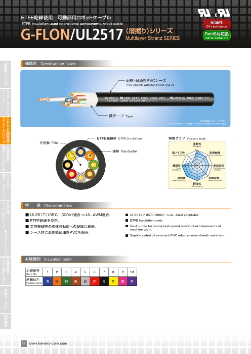 ロボット用計装&制御ケーブル(可動部用)F-UL-CL3・F-UL-CL3SB(シールド付)UL、cUL,NFPA70,79対応ケーブルVDE(CE)計装と制御ケーブル特徴 〇熱可塑性エラ...