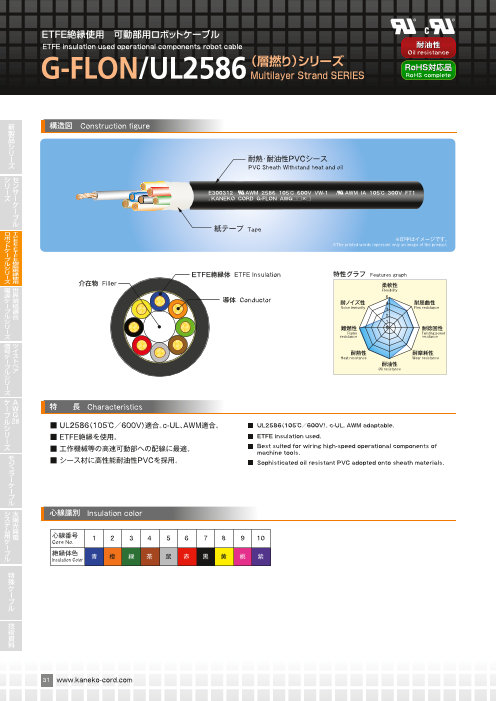 ◆UL2586(105°C/600V)適合。c-UL、AWM適合。◆ETFE絶縁を使用。◆工作機械等の高速可動部への配線に最適。◆シース材に高性能耐油性PVCを採用。◆詳細はカタログをダウンロ...