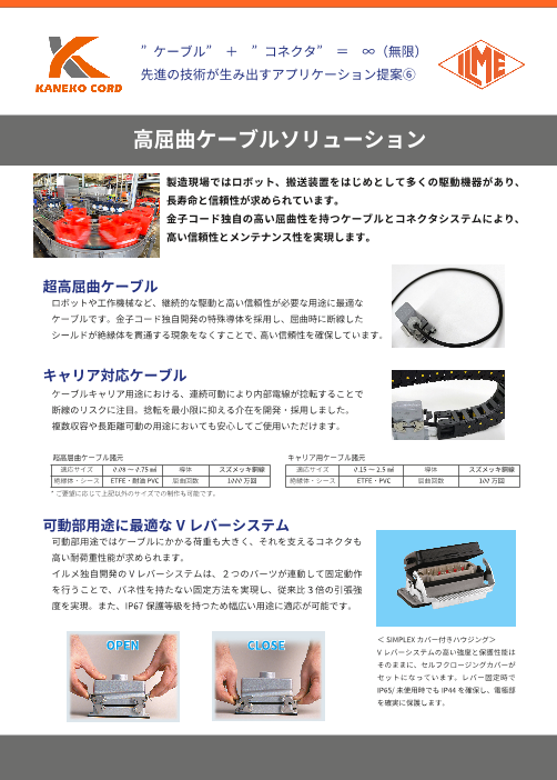 〇超高屈曲ケーブル〇キャリア対応ケーブル〇可動部用途に最適なVレバーシステム◆詳細は、カタログをダウンロードしてご覧ください。