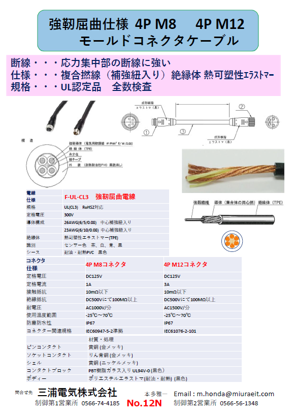 強靭屈曲仕様の4P M8・M12のモールドケーブル
