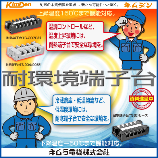 電線の接続や中継に欠かせない端子台ですが、一般的な製品の使用環境は-10〜50℃。耐久性でお困りの方も多いのではないでしょうか?キムデンでは、一般的な端子台ではカバーで...